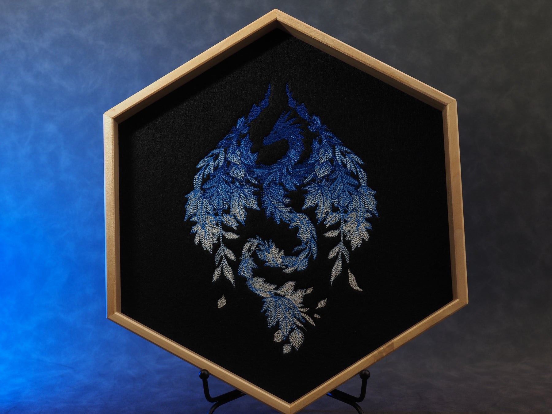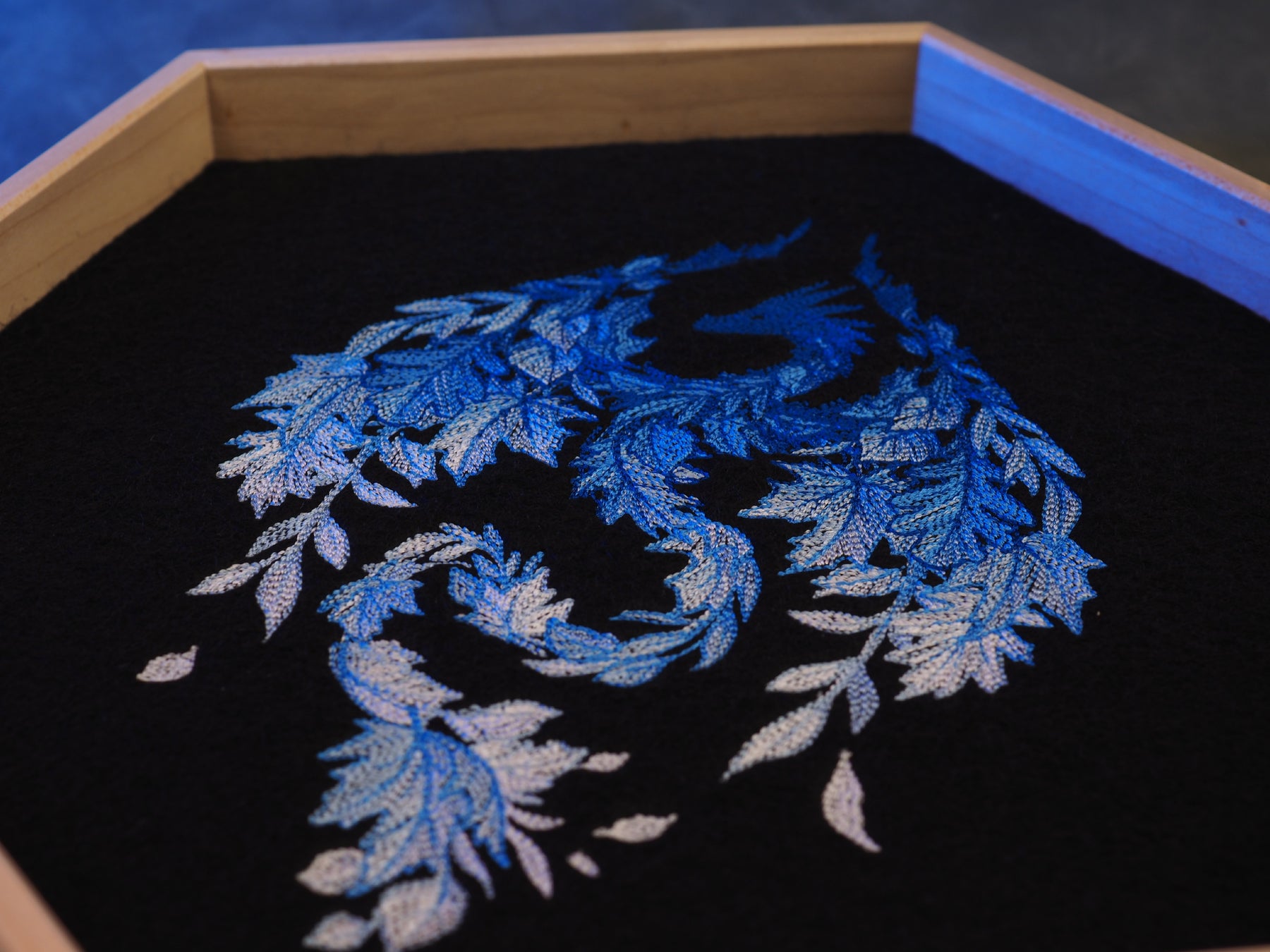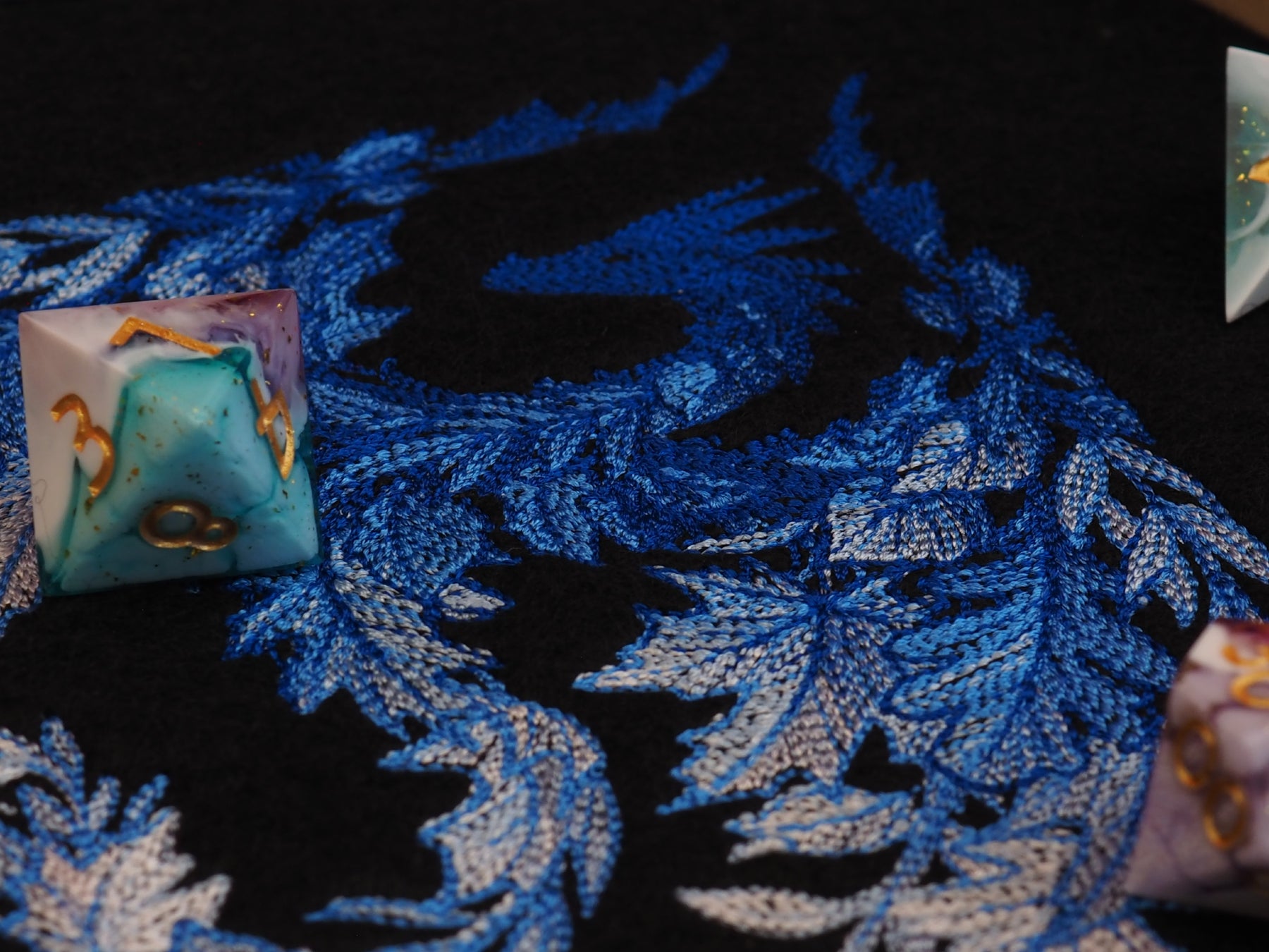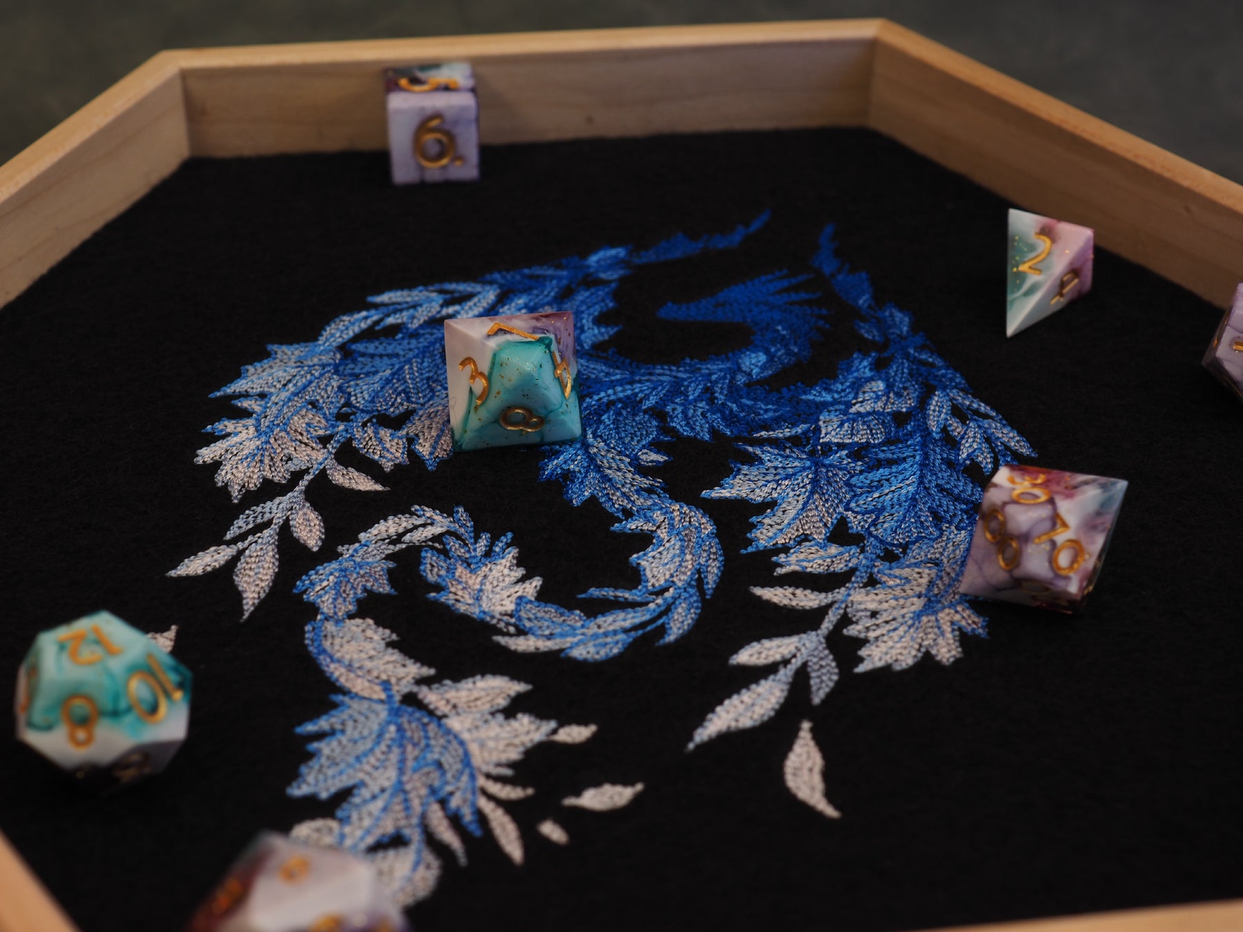 Dieses Dicetray besteht aus Ahorn-Holz und wurde von embersaw_gamingcraft aus Aachen für uns hergestellt. Das Motiv wurde von uns auf Filz gestickt und mit einer Schicht Kork zusammen ins Tray geklebt. Filz und Kork haben zusammen eine Schichtdicke von 5mm, wodurch Metall, Edelstein und Glaswürfel gut aufgehoben sind.