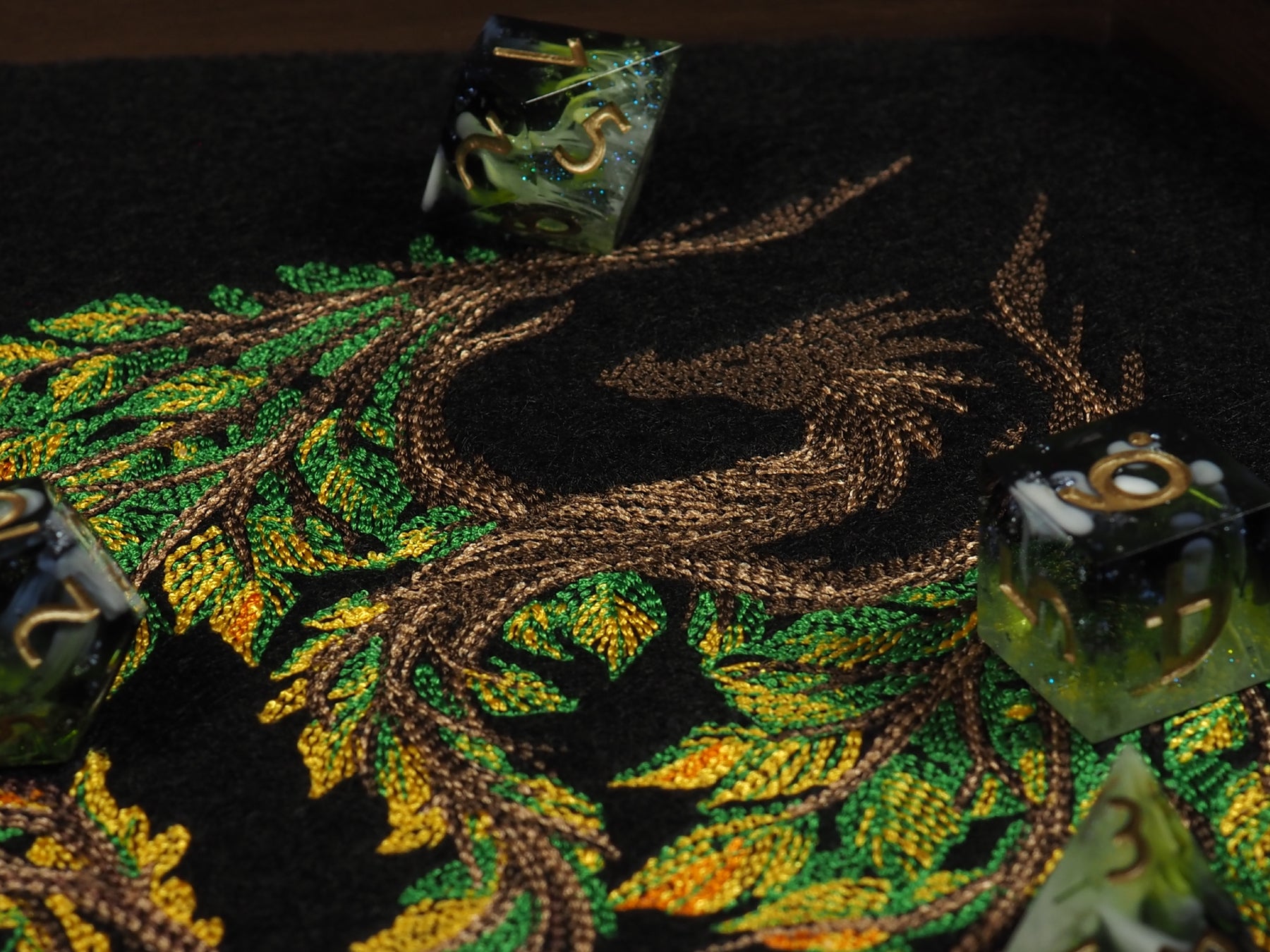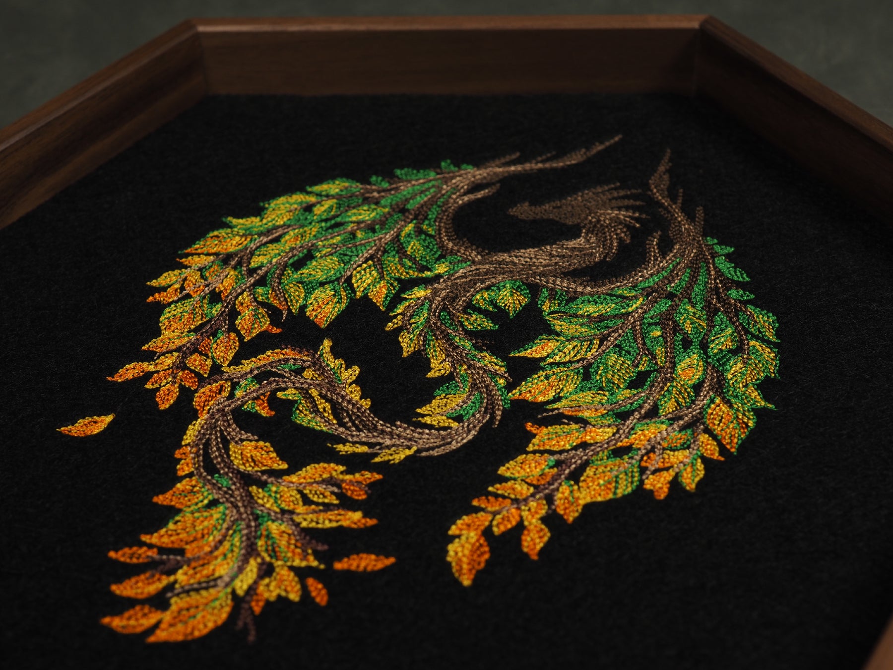 This dicetray consists of a felt fabric that we machine-embroidered and glued to a layer of cork in a bamboo bowl.